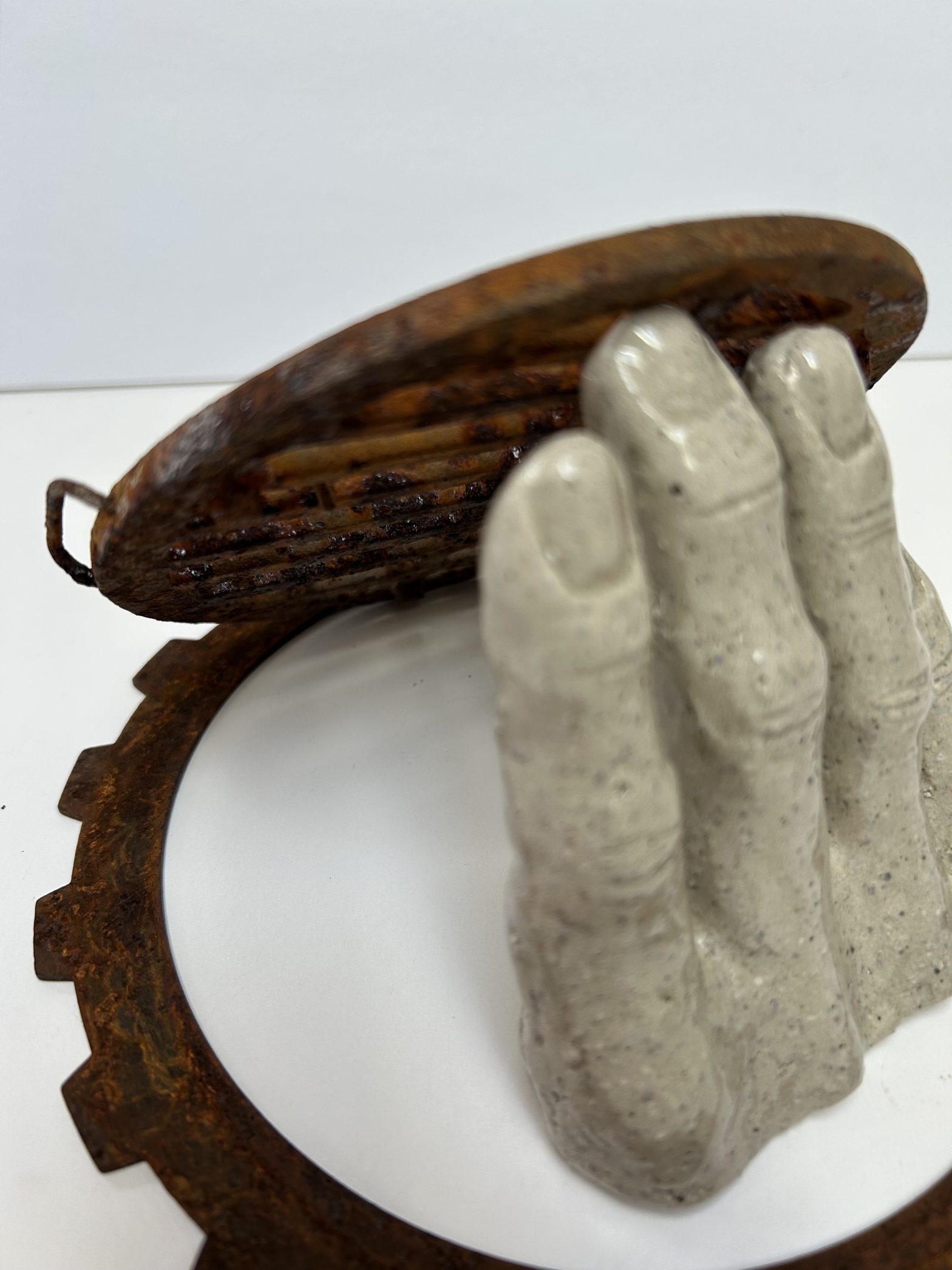 At the Metchosin Art pod for the ‘Pieces of me’ exhibit June 2024, Metchosin, BC, Canada Won the honorable mention from jurors. Onward, 2024 Stoneware clay, glaze, found metal. 24” x 16” x 4” available